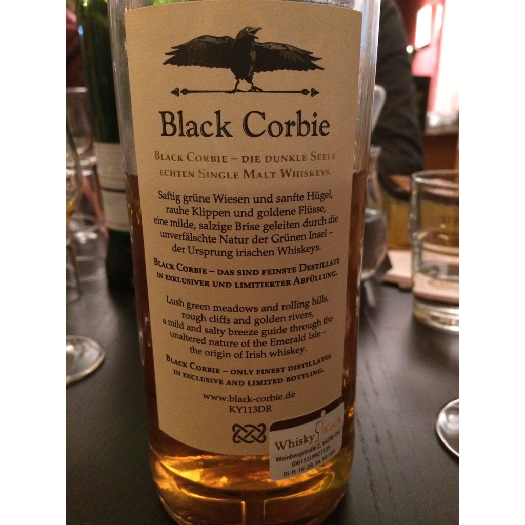 Es handelte sich um einen Black Corbie Boyne No. 5, abgefüllt von Rolf Kaspar Spirituosen in Essen. Der Boyne No. 5 stammt aus dem schönen Irland und ist mit 58,8% abgefüllt. Es handelt sich um eine Single-Cask Abfüllung in Fassstärke von 58,8%. Gelagert wurde der Whisky 14 Jahre lang in einem Refill-Sherry Fass. Die Destillerie wird nicht genannt. In diversen Foren und auf anderen Webseiten wird aber Cooley als vermutlich Quelle genannt.