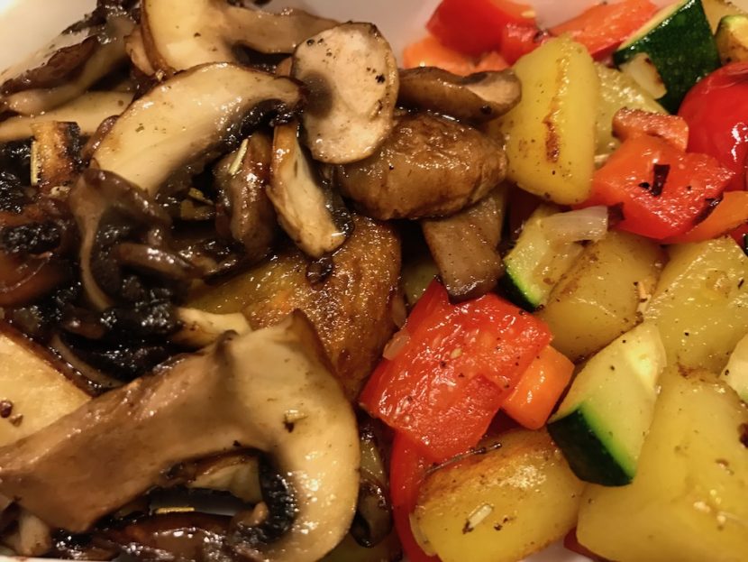 Für das mediterrane Kartoffel-Gemüse die vorgekochten Kartoffeln würfeln. Die 1/2 Zucchini waschen und ebenfalls in Würfel schneiden. Die Paprika vierteln, entgraten und in Streifen schneiden. Die zweite Zwiebel schälen und fein würfeln. In der Pfanne Olivenöl erhitzen und etwas Salz in der Pfanne verteilen. Die Kartoffelwürfel anbraten, biss sie anfangen leicht zu bräunen. Zucchine, Paprika und Zwiebeln zugeben. Wer mag fügt noch etwas fein gehackten Knoblauch hinzu. 1 TL Rosmarin hinzugeben und alles auf kleiner Flamme weiterbraten, bis die Zucchini weich sind. (Je nach Gusto dürfen sie natürlich auch noch leicht knackig sein.) Mit Salz und Pfeffer abschmecken und neben der Bulette anrichten.